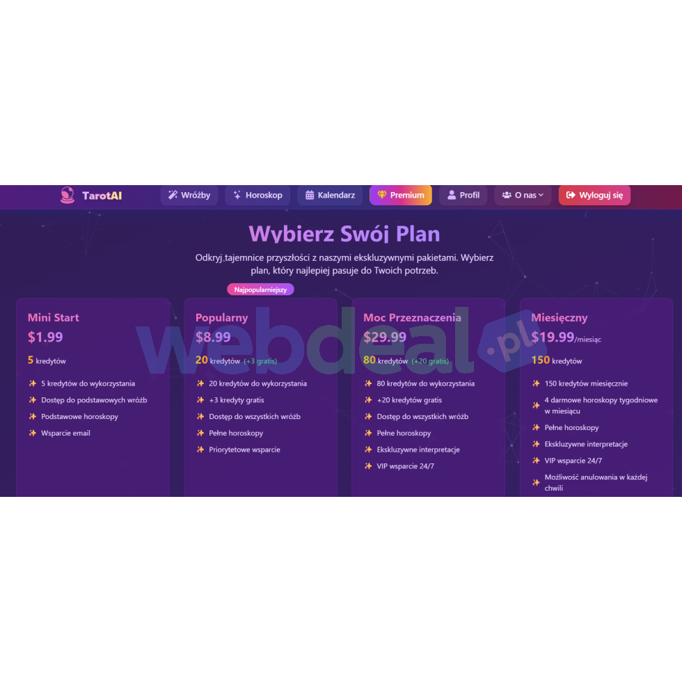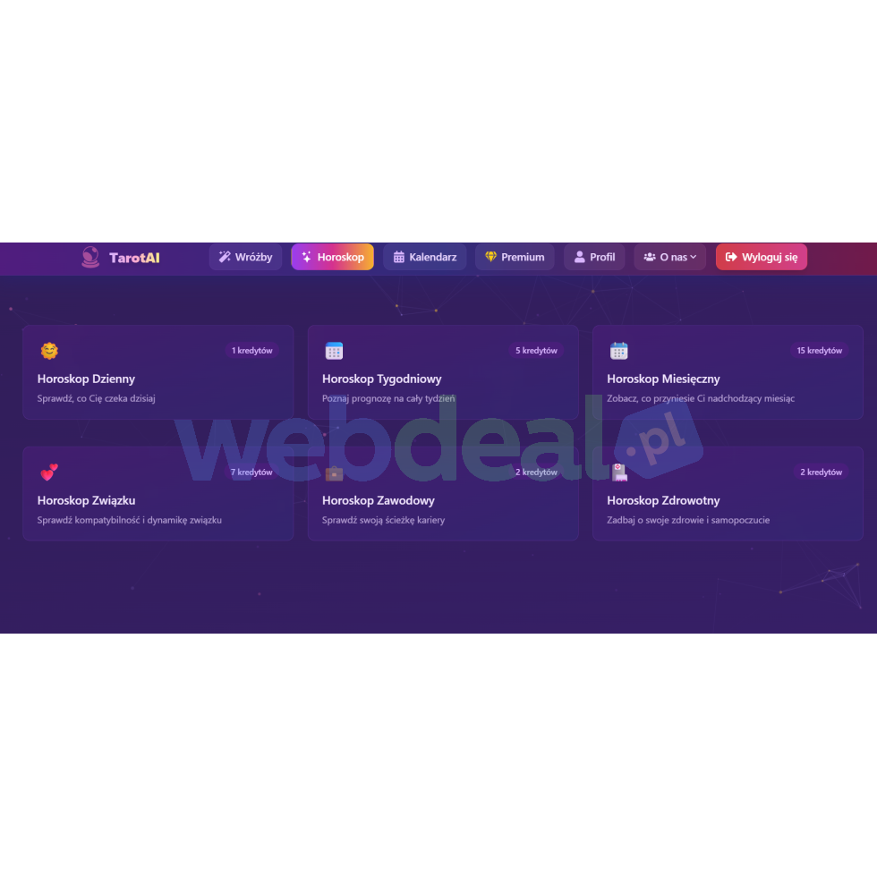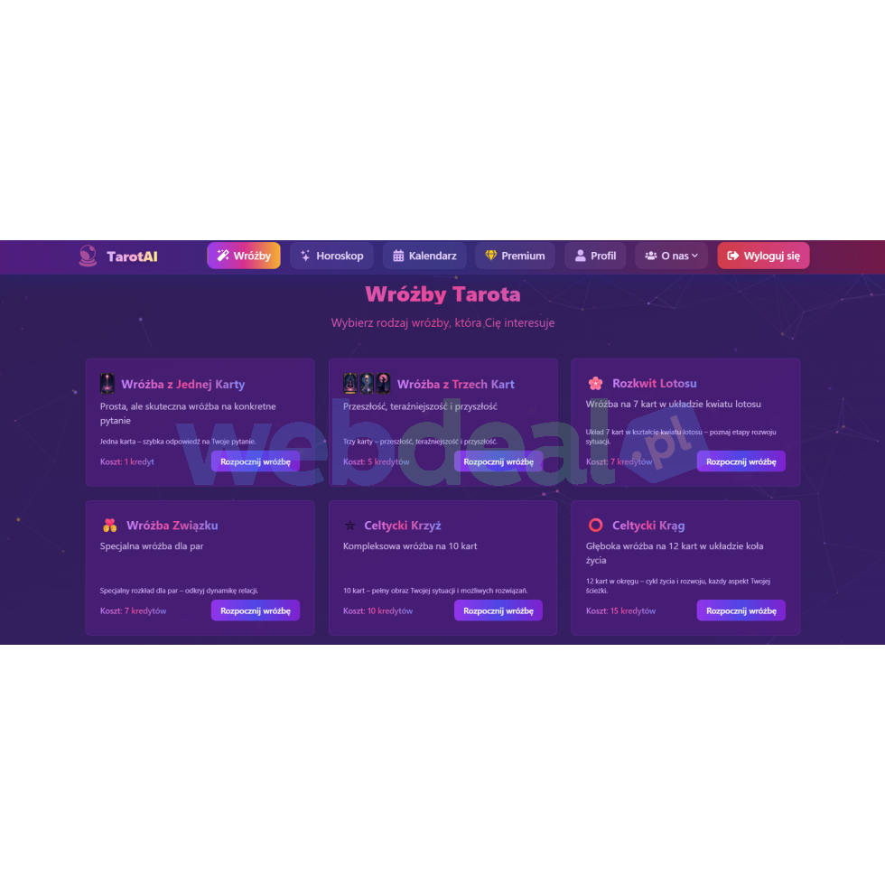 TarotAI.pro to nowoczesna platforma SaaS oparta na sztucznej inteligencji, która łączy tradycję tarota z technologią przyszłości. Strona została zaprojektowana w prosty i przejrzysty sposób, aby każdy użytkownik – zarówno początkujący, jak i zaawansowany – mógł szybko i intuicyjnie korzystać z usług.